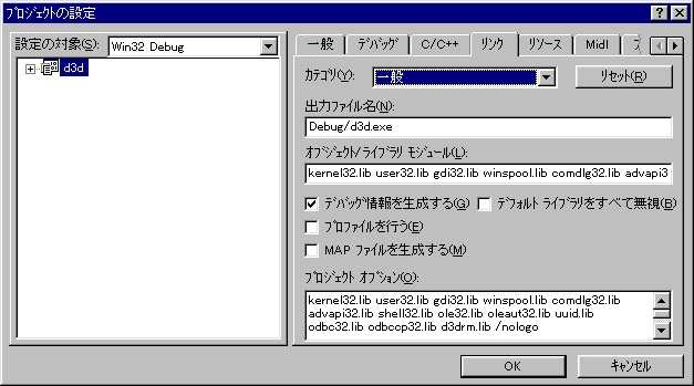 メニューバーから、[ツール→オプション]を選び、出てきたウィンドウの中から[ディレクトリ]と書かれたタブを選びましょう。ここまでが出来なかった人は近所のハッカーの人に助けてもらいましょう。ハッカーさんの助けが無くても出来た人は、左のような画面になっているはずです。VCのバージョンによって表示が微妙に違いますが、その辺は自分で補って下さい。 画面中の[表示するディレクトリ]から、[インクルードファイル]を選択します。下のディレクトリ一覧が更新され、VCのインクルードファイルが置かれているディレクトリが書かれています。この欄に、DirectXSDKのインクルードファイルのディレクトリを追加します。私の場合は、上の画面の通り、 [C:\Program Files\mssdk\include] となっています。人により設定は違うので、その点は注意して下さい。ちなみに、デフォルトでSDKをインストールした場合、 [C:\mssdk\include] だったと思います。 ディレクトリを書き終わったら、そのディレクトリをリストの再上段に移動します。Visual C++では、インクルードファイルをサーチする際に、上段のフォルダからサーチするので、記入したフォルダを最上段に置かないと「DirectXのインクルードファイルを見つけられない」とVC++に怒られてしまいます。「機械の癖に生意気だぞ、この野郎!!」等とパソコンのモニタに向かってキレる前に、ちゃんと設定してあげましょう。 同様に、[表示するディレクトリ]を[ライブラリファイル]に変えて、ライブラリの追加を行います。デフォルトパスは [C:\mssdk\lib] となります。これは、名前のとおりライブラリファイルのパスの設定です。パスを設定したら、先ほどと同様に最上段に移動しましょう。 以上2つの操作でビルド時のサーチパスの設定は終了です。サーチパスの設定は一度行うと記録されるので、他のファイルを開いたときに設定し直す必要はありません。 しかし、次のライブラリの追加は毎回行う必要があります。必要なライブラリ名をテキストファイルに書いておけば、そこからコピー&ペーストで使いまわしが効きます。 ![]() メニューバーから、[プロジェクト→設定]を選び、そのウィンドウ中のタブから[リンク]を選択し、上のような画面を表示してみましょう。ここには、プロジェクトをビルドする際に必要なライブラリ名が[オブジェクト/ライブラリモジュール]の欄に書かれています。実際は使われていないライブラリが多いのですが、取りあえず今回は追加のみです。間違えて消した場合は新たにプロジェクトを作りましょう。 [オブジェクト/ライブラリモジュール]の欄に, ddraw.lib d3drm.lib の2つを追加します。各ライブラリ名の間は半角スペースです。忘れないようにしましょう。 今回はDirect3D RMを使うので、d3drm.libを使います。また、Direct3D RMはDirectDrawを使うのでddraw.libが必要です。他のDirectXのプログラムを作る場合は他のライブラリが必要になります。その辺は、臨機応変にいきましょう。柔軟性は大事です。 以上で設定が終了しました。やってみると意外と簡単です。ここまでやってもビルドできない人は、 ・DirectXが正しくインストールされているか ・ビデオカードのドライバは最新のものか ・プログラム上に誤りが無いか を、改めて確認しましょう。ちなみに、私はプログラムのミスに気づかず、1月近く散々悩んだことがあります。いやあ、今となってはいい思い出だ・・・(汗 まとめ ・SDKをインストールしたら真っ先にサーチパスの設定を行う ・ライブラリの追加はプロジェクトごとに行う ・自分のプログラムを過信しない(反省してます・・・) 電脳館 written by みや Last Update 2000.10.31 |
