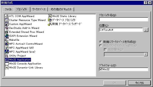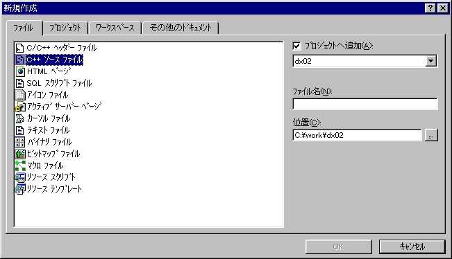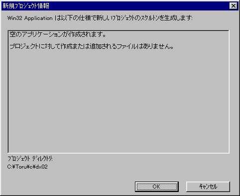 プログラムの解説は・・・省略しましょう。と、いうよりは、筆者がプログラムを全く理解していません(苦笑 しかし、全く解説が無いとこのページの意味が無いので、少しだけ解説しましょう。 まずはWinMain関数よりInit関数が呼び出され、ウィンドウの初期化が開始されます。このInit関数自体はウィンドウ作成の基本なので、VC++をやった事のある人はこのような物を見た事があるかも知れませんね。 続いてWindowProc関数がInit関数より呼び出されます。WindowProc関数ではDirectDrawの初期化、及びメッセージボックスの作成を行っています。 WindowProc関数から戻ってくるとInit関数でウィンドウの作成。それが終わると、WinMain関数でプログラム終了までメッセージループが繰り返されます。 以上、簡単ですがプログラムの解説をしました。この説明でわからない場合は、筆者にメールをください。もっとわかるようにこのページを書き直します。なにぶん、素人なもので・・・(汗 それでは早速、上のプログラムを実行させてみましょう。 [ファイル→新規作成]と選び、[プロジェクト]タブを選択。下の画面を表示させましょう。 ![]() この中から、画面中で選択しているように、[Win32 Application]を選択します。プロジェクト名は適当でいいですが、このページのタイトルにちなんで、[dx02]としておきました。 OKを押すと、下のような画面になります。 ![]() この中から、[空のプロジェクト]を選択しましょう。OKを押すと、下の画面に移ります。 ![]() これで、プロジェクトが完成します。プロジェクトを作らずに、ソースファイルのみから作ろうとすると、外部リンクが出来ずにプログラムが実行されません。空のプロジェクトを作り、ワークスペースが作られないとプログラムは実行されないようです。 続いて、プロジェクトに空のソースファイルを追加します。[ファイル→新規作成]を選び、[ファイル]タブを選択します。下の画面が表示されたら、リストの中から[C++ソースファイル]を選択しましょう。 ![]() 出来た空のソースファイルに上のソースをコピー&ペーストしましょう。これで準備完了です。 それでは早速、プログラムを実行してみましょう。プログラムの実行は、[ビルド→実行]、又はF5キーを押しましょう。 さて、実行結果は・・・あれ?エラーが発生しています。 dx02.obj : error LNK2001: 外部シンボル "_DirectDrawCreateEx@16" は未解決です Debug/dx02.exe : fatal error LNK1120: 外部参照 1 が未解決です。 ・・・どうやら、プロジェクトにライブラリを追加するのを忘れていました。プロジェクトに[ddraw.lib]を追加しましょう。詳しくは前回「1.DirectXプログラムのビルド方法」を参照して下さい。ちなみに、今の失敗はわざとです。ライブラリの追加を教えるためにやったものです。いや、本当に。勘弁して下さい。
