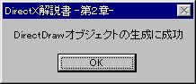 さて、気を取り直していきましょう。今度こそ、プログラムが実行できるはずです。実行すると、まず最初に左のようなメッセージボックスが表示されます。これが表示されたという事は、実行したパソコンで正しくDirectXが動いているという証拠です。OKを押すと、次の画面に移ります。