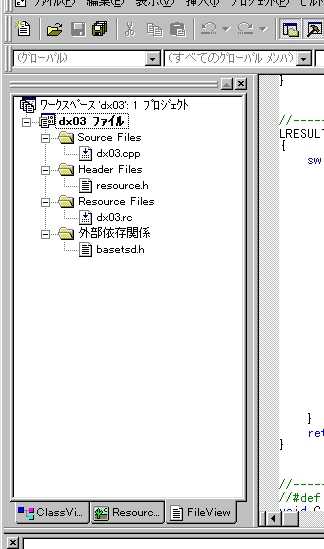 というわけで、先ずはリソースの説明から入ります。普通VCでプログラムを作った場合、メニューバーの内容は、全てリソースファイルに書かれています。リソースファイルに書き加えることで、メニューの内容は増えて行くわけです。左の画像を見て下さい。これは、今回作った[dx03.dsw]なるワークスペースの構造なんですが、この中にある[dx03.rc]と[resource.h]がリソースに関わるファイルです。この辺の詳しい説明は、私より詳しく説明してくれる人がいると思うので、割愛(笑 では、早速ですが[dx03.rc]の内容です。