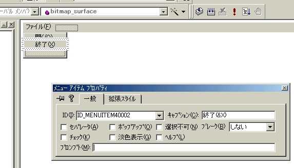 先ずは前回とほぼ同じ物を作りましょう。リソース選択から[Menu]を選び、新規作成してください。メニューバーに何も入ってないものが出ましたか?メニューバーはこの状態から作っていきます。メニューバーに本来文字が入っているところが、黒い点線で囲まれています。ここをダブルクリックすると、「メニューアイテムプロパテ」なる物が表示されます。まずは、メニューバーの[ファイル]を作るので、「キャプション」の欄に、以下の文章を書き込んでみて下さい。 ファイル(&F) これでOKです。後は、VCが自動でやってくれます。いつも使用者にヒーヒー言わせてるんだから、これぐらいVCがやってくれないとコッチとしてはやってられるかってんだよ!!こん畜生があ!!! げほっ、げほっ、失礼しました・・・。余計なことは抜きにして、さっさと先に進みましょう。[ファイル]の作製が出来たら、[ファイル]の下に、新たな黒い点線で囲まれた部分が出来ます。それでは、先程と同様の操作を行います。キャプションの欄に、以下の文章をコピー&ペースト又は手で書き込んでください。モニターに鉛筆で書き込んだ人は・・・そんな奴いるか!! 終了(&X) これでメニューバーが完成しました。完成結果はだいたい下のような画面になっている筈ですが。 ![]() それでは、[Ctrl + S]を押してリソースファイルを保存してください。保存したリソースファイルと[resource.h]をプロジェクトに追加して下さい。リソースファイルを作ると、VCは自動的にヘッダファイルを作ってくれるんですね〜。こういう時だけ、「VCすげー!!」って思うのは、私だけでしょうか。 前回のプログラムと[resource.h]の内容が違うので、メッセージループを書き換えなければいけません。具体的には、前回「IDR_EXIT」としていた部分を「IDR_MENUITEM40002」に書き換えます。リソースをVCが自動的に作ると、それに合わせて自分で作ったソースファイルを書き直さなければならないんです。うーん、便利なのか、不便なのか・・・ さて、ここからが本番です。今回のタイトルは、「スライドショーを作ろう!!」なのです。今回作るアプリケーションの主な使用は、次のようになります。 ・640x480のフルスクリーン表示 ・表示させるファイルは[sample01.bmp]〜[sample04.bmp]の4つのみ ・・・とまあ、簡単なものですが、ここで聡明な皆さんなら気づいたことがあると思います。そう、「フルスクリーン表示だとメニューバーが表示されない」のです!!なんとまあ、先程作ったリソースファイルが全くの無駄になってしまいました。あらあら・・・ 仕方ないので、先程作ったリソースファイルは破棄してしまいましょう。まあ、こういう物でも作っておけば後で役に立つはずです。多分。言い訳だけど。 ということで、このままではスライドの切り替えが出来ません。ここは一つ、キーボードで制御するようにしましょう。その結果、先程の使用に次のものを加えることが決定しました。 ・矢印キーの右を押すと次のスライド、左を押すと前のスライドに移る ・Escキーでプログラム終了 主な使用が決まったので、それでは早速プログラムの作成に入ろうと思います。先ずはフルスクリーンの制御から。 名は[bitmap_surface]とでもしておきましょう。下にプログラムの詳細を表示します。