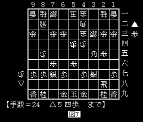 図7の局面になると後手は棒銀は間にあいそうもないし、まだ△7一銀の形なので△4五歩からの盛り上がる展開にできない。