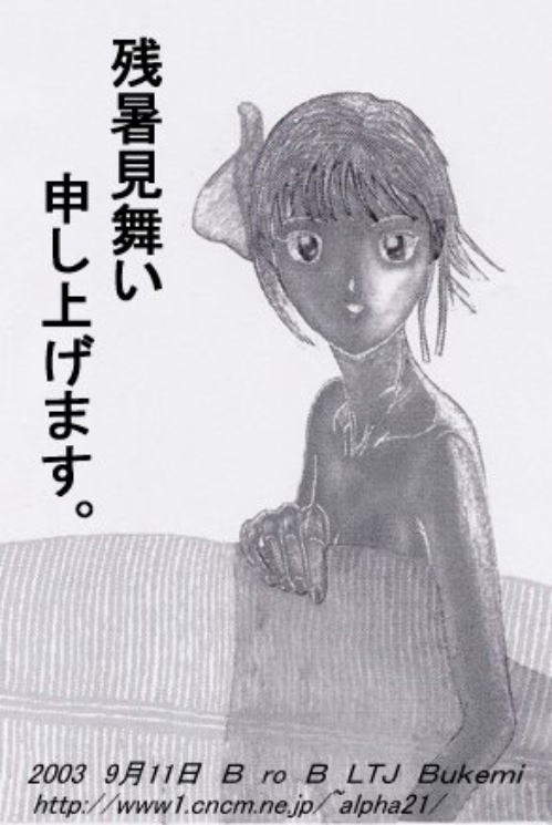 『LTJぶけ美』さんから頂きました残暑見舞いです♪♪ 何かモノクロの絵みたいで風情があって良いですね♪♪手にもっているのはでかい葉っぱ!?でしょうか。確かあんなでっかい葉っぱを何かの写真で見たことがありますけど。あれだけでかいとばかでかい笹舟に似たようなもの作れそうですね♪♪ ありがとうございます♪