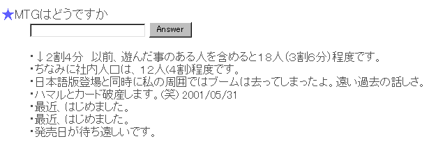 | DIALY | 01/06/30 「最終回は、最後までつきあった人だけが楽しむことを許されるのデス」 の巻 1)PM2時に起きるとそこはパラダイス、電話で麻雀しにくると後輩から電話。断る勇気も権利も力さえなく了解、ロマン徹マン開始。 2)とは行かず、第二の部活をPM7時から。ナイスガイが来ていなかったので、電話すること12コール。この遅さは寝ている為だ!と思いつつ待っているとスガイ電話に出る。出るなりアフリカ編のジャンよろしく歌い始めるナイスガイ。 「ハメハメハー、ウッ、ハメハメハー、ウッ、・・・・・・」 しかし即座に俺は「確かに遅刻はしてるな、うん。でもな、今雨は降ってないぞ!?早く来い、じゃあな」と言い残して電話を切る。ナイスガイの放置プレイ的会話にはこれが一番かもしれん定石発見。んでもって適用した場合、俺が資金的に孤立するのに100ガバス。 3)AM3時から麻雀再参加、翌朝9時半まで。よくやるよホントに・・・。 4)今年(2001年)も半分終わっちまいました。何をやるべきで何をやったか考えても良いと思うんですが、どうでしょう自分。徹マンばかりでは霞にも劣ると思うのですがどうでしょう自分。ま、去年よりは幾分生産的でしたが。 (部屋指数:5) 01/06/29 「みかづきよりもあおいよる」 の巻 1)同志kondo-の協力を得てアクセス解析を導入。開発段階らしいので注文で進化可能。へんてこ結果が出てくれないかと期待しきり。ちょっとそこのあんた、何処にあるかなんて探さない!!(笑)逆に、このページの無断リンクからReferをたどってきた方、誠にすいません。 2)先日落とした「魂狩」のOPを見てみる。wowowの新番か何かと思ったらBSデジタルだったんですね。そっちのほうには疎いモンで全く知りませんでした、恥ずかしいたら。そこら辺を彷徨ったら、ちょっと気になることがあったんで調べてみたら・・・元ネタはこうらしいです。作る側に回るとこんな事も出来ちゃうという証拠ってことで。俺の仕事もそんなことが出来るのかなー?と思ったり思わなかったり。ところで何時の間に影山ヒロノブと水木一郎はペアになったんざんしょ?この頃一緒にいるところばかりお目にかかる。 3)連続バイトな毎日。金無い学生は食を削るか働くか。私はバイト先で飯を食い、そして金を貰う。それは合理的な金儲けの在り方。ただし、「その金を何処に使うか」と、「その金を稼ぐのにかけた時間にやれた他のこと」を考えなければね・・・(使わないという選択肢は無いらしい)。 4)文の中で、どこに句読点を打ったら良いか分からなくなりつつある。考えたことを推敲もせず書き出しているので仕方の無いことなのかもしれないが、いかんせんリズムが悪い。書いている途中で文章の終わりまで見通す力が無いのか弱くなっているのか。どちらにしろ読みにくい事この上ない。皆様はどうなさっているのだろうか?俺の国語力が著しく世間の平均を下回っているのでしょうか?いいや書き慣れていないだけさ、と心に慰めを。 (部屋指数:0) 01/06/28 「あんたハンマーかい!なぜ漁船に乗る!?」 の巻 1)野菜たっぷりちゃんぽん、ゴーヤー&唐辛子 く、食いて〜(じゅるっ)。だけどリンガーハットなんて金沢じゃ見ませんな。自分で作れば良いんですが、野々市JASCOが無くなったせいで身近ににがうりが売ってないです。ちょっと出歩けば在るのかもしれないけど、そこまで手間はかけたくないし。うむむ、やはり近江町市場まで買出しに行かねばならんのか・・・。 2)銀河雀雄伝説@わへい様方 ここ、裏ニュースに「機動雀士ジャンダム」で紹介されてたんですが、銀英伝パロの雀雄伝も糞笑えますな。何といってもそのボリュームが凄い。現在は76話まであるようです。 帝国軍雀師A 「ビッテンフェルトは危険牌をきったのか?」 帝国軍雀師B 「・・・すこし違うな,奴がきったのを危険牌というのだ」 ユリアン:「提督はなぜ,リーチをなさったのですか?」 ヤン:「決まってる.他に役がなかったからだ」 ぶはははは、それだ、それ!!! 3)今回の蒼天の拳、予想と少し違ってはいたがほぼ的中。俺の予想では、金が秘功を打たれる→爺さんが生きて出てくる→何故殺さなかったのだ→先ほどの秘功を帳消しする秘功を打つ→金さん感動し改心(?)→弟子入りし後のリュウケンとなる→回想シーン中断。というのが俺の中の流れだったのですが、そこまでは当らなかった模様。どう北斗と繋がるかが見もの。話は変わるが原哲夫先生は長年の酷使と病気で、片目が殆ど失明状態なのだそうだ。そんな状態になっても原稿を書きつづけえる姿、うらやましい・・・。俺もそんなことが出来る男に成れるだろうか? (部屋指数:0) 01/06/27 「kitto atui kutibiru」 の巻 1)先日の武器がイカしてると思ったら、今度はハルコンネン。作るんだね、ホントに。 2)この頃のお気に入りソフト、「右クリックサーチ君」 何がイイって、格納できるモノの数が凄い。ま、検索は所詮googleしか使わないので関係ないですが。弱点らしい弱点も見当たらず、自分