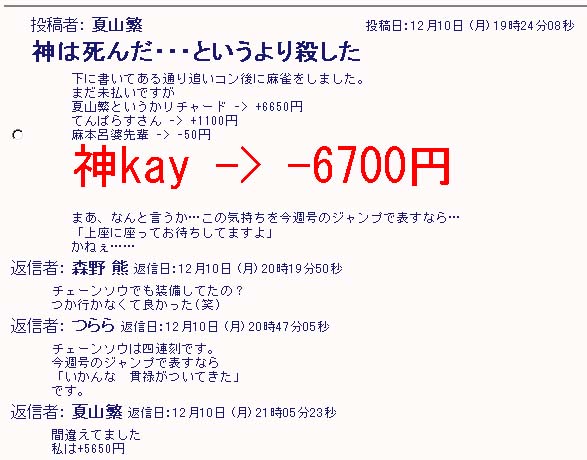 | DIALY | 01/12/31 「1ターン目に早くもブラックホールとステカセキングを展開し始める。早い。」 の巻 ■水上温泉の旅館での心地よい目覚め。朝5時半に露天風呂に行く。人は居らず、外は雪。空を仰げど、息は白し。 ■毎年恒例、大晦日越え忘年会in熊谷。高校時代のいつもの面々(今回は10人)と語り合いつつ今年を振り返る。このメンバーも学生は3人を残すのみとなり、来年にはひとりのみとなる。といってもそのひとりも東大の博士課程なので、いわば職業軍人といったところか。こんな関係がずっと続くといいな。 そうして今年も終わる。 (部屋指数:0) 01/12/30 「「´Д´д`」@ビッグボディチーム 」 の巻 ■少々サボっており申した。見に来てくれた方々、申し訳ない。 ■本日金沢撤退戦。部屋は汚いまま置いていき新年を迎える方針ではあるが、パソのデスクトップくらいは綺麗にして行こうと。以下、HD内で発掘された下らないモノ達。 ・感動の原動。あながち笑えない。生まれたてのアヒルと人間は同じ生き物であるという道理。 ・ズバット参上。恋力は何でも解決です。 ・死亡報告。ドアが無いとハマリます。 ・死亡報告弐の巻。ビットでもハマリます。 ・遥か昔の物語。授業作成物。20才…。俺にもこんな時代が…(以下略)。 ■金沢は石引温泉に行く。第7餃子に行く途中の、川を渡ったところの丘にある温泉だ。湯は炭酸水素泉で同時に鉄泉でもあり色は茶色。ぬるぬるするのが最高だ。丘に建っているので入り口は一階と三階の二箇所に在る。温泉に行くというのに、いきなりエレベーターに乗るってのはなかなか味わえない、結構良いかも。 露天風呂は外が見えるわけではなく、それも湯が極端にぬるいので不可。だがしかしサウナが標準装備。湯船は広いわけではないが「昔の銭湯」という感じがして小気味良い。温泉から出て休憩所で休憩するのだが、景色がまたナカナカ…。丘の上の立地からか金沢の夜景が拝めるのが良いところ。 帰りには火頭山ラーメンでとろとろ肉ラーメンの塩を頂戴する。まあ、程々に美味かったが、あの肉の脂では辛いお年頃の人も結構居るだろうにと。そのためのお肉別皿なのか…。 ■身内業務連絡。TeTeTeファクトリーことヤスイ君の(一部の人間に)予想どおりのご成婚を踏まえ、彼が金沢に居る1月6日までに新年会をやろうかと。当方では1月5日の夜辺りを予定しているのですが、皆さんの予定はいかがでしょうか?実はまだヤスイ氏に連絡を取っていないので予定は予定の状態ではありますが。現在の参加表明者はA2氏、ohasu氏の2名であります。実際の話、今年度でこれ以降「金沢で集合がかかる」機会は年度末の煩雑さと都合の合わなさを考えても最終チャンスであると思いますので、関係各者こぞって参加の程を。r_jkl先輩の予定なども考慮しつつ決定したいと思います。尚、kay亭は4日より通常運行に移行する所存です。早くもohasu氏の宿泊が決定しておりますことをお伝え致します。 ■ではこれから群馬は水上温泉に行って参ります。31日の更新は1日になるでしょう。それでは皆さん良いお年を。 ■いつの間にか当HPが開設1周年になっているのに気づく。バンザーイ、力とは継続と太さナリー! (部屋指数:0 ICQにナイスガイ) 01/12/26 「Komm her zu mir,Geselle,Hier findst du deine Ruh' ! 」 の巻 ■先日、俺のこれまでの人生で初めての体験をした。それはゲーセンで起こった…。 「リアルファイトッッ!!?」(一部誇張アリ) バーチャロンというゲームは対戦ゲームである。それを踏まえてのお話。 俺と俺の友人ベンジャミンはバーチャロンフォースという2VS2の対戦ゲームをやるべく一緒に並んでいた。そしてプレイしている奴等が中ボスに負けてゲームオーバー、かくして俺達の出番がやって来たわけだ。相手を見ると軽量級のキャラ×2を伍長と軍曹の奴が扱っていた(このゲームはカードに戦績データを蓄積でき、階級が上がっていく。俺/ベンジャミンは士長/曹長。尉官>曹長>軍曹>伍長>兵長)。 一本目…余裕勝ち 二本目…又も余裕勝ち 三本目…相手放置(!?) 何と相手は席を離れている!?俺達にはかなわずと見てか。折角なのでボコって勝利。何だ、軍曹とかでも大した事ねえなぁ…とか思っていた次の瞬間、ベンジャミンに先ほど対戦していた奴の蹴りが飛んだ!!? 「乱入シテクンジャネーヨ!!!」明らかに目が飛んでいる…。 瞬時に蹴りを喰らいながらも次の一撃に備えるベンジャミン、間髪入れず席を飛び出す俺、脊髄反射で店長を呼びに行った頼もしい常連達…。 かくして二撃目は振り下ろす間もなく終劇と相成った訳だが…。店長が説教をくれている間も、奴はそちらを向く事は無く。俺はそいつにひたすらガンを飛ばし、ベンジャミンはゲームを続行(笑)。 その後笑い話になったのは当然だったのですが…。ベンジャミンが友人のY・Y君にメールをすると、返事が。 「吊るせ!」 (部屋指数:0) 01/12/23 「心はまだ壊れてないよ。」 の巻 ■おじゃ魔女の歴史。おじゃ魔女史を遡ること2000年