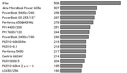 上の図はベンチマークソフト「Norton SystemInfo」でHDの速さを測定した物です。これではPerforma6310がだいたい218くらいでよね。このHDは6310の標準のHDです。しかし注目は「LC630/256」と「Performa630@40MHz」は同じマシンなのにこんなにも速度が違います。これはPerforma630@40MHzのほうがHDを高速な物と交換しているためこの様な速度の差が出ました。つまり、6310もHDを交換する事によって速度の高速化が期待できるということです。Perfoma6310はHD をIDE(ATA-1)で接続していますので低コストで高速、大容量のHDと交換できます。2000年はじめの相場だと2万円あれば13~15GBクラスの新品が買えます。今の主流の規格はATA33(66)ですが、その規格のHDも、問題なく6310に積むことができます。そこでちょっとしたTipsを。