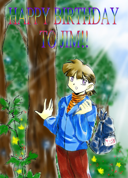 M1:ジムの誕生日お祝いイラスト!実は...ジムの誕生日の日付け 毎年覚え間違ってます...(いつも2/11だと勘違い)気付いたらもう とっくに過ぎちゃって...ごめんなさい〜〜だからまた遲くなっちゃい ました...... ジムはARブーメランズの中皆一番覚えているキャラでしょう...でも 全チームの人気いまいちだから、例え二枚目でかっこよくても、ジ ムは不人気...悲しいと思っていても、私何にもしてあげられなくて... まあ、誕生日覚え間違った時点からもう人を言う資格無くしました けど...それにいつになっても私はジムをうまく描けません......(泣) 背景とか髪の色とか描くのに力はいってて手が痛いのに、顔がだめ だと何にも綺麗に見えるはずがありませんね...この一枚の華麗度 もなんか足りませんし....大失敗なんですね... |