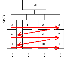 ■ メモリ。Memory。 主記憶装置、 高速にアクセスできる半導体メモリで構成される。 書き込みの可否によって、RAMとROMに分類できる。 ■ メモリインターリーブ。Memory Interleave。 メモリの処理を高速化する技術の1つ。 主記憶を、バンクと呼ばれる複数のブロックに分けるとともに、 隣り合ったバンクに連続するアドレスを与えること。 こうするとCPUは、 複数のメモリバンクに同時に並行してアクセスすることとなり、 同じバンクへのアクセスの競合を防止し、 メモリアクセスにかかる遅延を減らすことができる。■ キャッシュ。Cache Memory。 CPUと主記憶装置(メモリ)の間に位置する高速の記憶装置。 CPUからメモリシステム全体へのアクセス速度を向上するために用いる。 頻繁にアクセスするデータを高速のメモリ(キャッシュメモリ)に格納し、 動作の遅い主記憶装置へのアクセスを不要とすることによって、 メモリアクセスの実効速度を向上させる。 ■ 2階層キャッシュ方式。 2段階にキャッシュメモリを設けること。 (1) 1次キャッシュ。 最も高速性を要求されるキャッシュであり、CPUチップ内部に置かれる。 ただし、記憶容量を大きく取ることはできない。 (2) 2次キャッシュ。 CPU外部に置かれるキャッシュ。1次キャッシュより大きなメモリ空間を持つ。 現在では、CPU内部におくこともある。 ■ キャッシュへのアドレス割付け方式。 (1) ダイレクトマッピング。 キャッシュメモリ上の特定のブロックと、 主記憶装置上のブロックを1対1で対応させる。 最も原始的なキャッシュ方式。 (2) セットアソシアティブ。 キャッシュメモリ上の複数のブロック(セット)と、 主記憶装置上の複数のブロック(セット)を、n対nで対応させる。 (3) フルアソシアティブ。 キャッシュメモリ上の全ブロックと、 主記憶装置上の全ブロックを、N対Nで対応させる。 参考URL http://home.att.ne.jp/red/OSAKOH/technology/Cacheop.html ■ キャッシュへの書き込み方式。 (1) ライトスルー方式。 キャッシュに書き込むときに、主記憶にも同時に書き込む。 キャッシュと主記憶の内容を常に一致させることができるが、 書き込みに時間が掛かる。 (2) ライトバック方式。 キャッシュだけに書き込み、 あとでキャッシュから追い出す(FIFO/LRU)ときに主記憶に書き込む。 書き込みは速いが、キャッシュと主記憶の内容に不一致が発生することがある。 ■ キャッシュのヒット率。 データがキャッシュメモリに存在する確率をヒット率という。 データがキャッシュメモリに存在しない確率をミス率(NFP)という。 (キャッシュのヒット率)=1?(キャッシュのミス率) キャッシュを使用した場合の、メモリ全体の平均読出し時間は、次式で求められる。 (平均読出し時間)=(キャッシュのアクセス時間)×(ヒット率) +(主記憶のアクセス時間)×(ミス率) 以上。 2004/03/10 pm