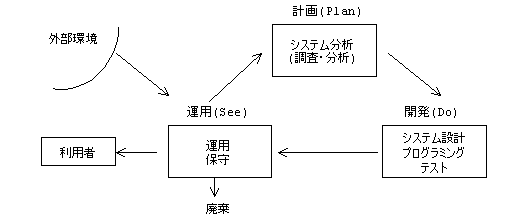 ■ ソフトウェアライフサイクル。 システムの開発は、 計画(Plan)、開発(Do)、運用(See)という3つのフェーズ(段階)に分けることができる。 この3つのフェーズをソフトウェアライフサイクル(SLC)と呼ぶ。■ ウォーターフォールモデル。 最も基本的なシステム開発モデル。 システム開発の各工程が終了するごとに必ずレビューを行い、 成果物がすべて出揃ってから次の工程に入る方法。 作業工程は、 トップダウンアプローチ(基本計画→外部設計→内部設計→プログラム設計→プログラミング)と、 ボトムアップアプローチ(各種テスト→運用・保守)の 2段階に分けられる。 ウォーターフォールモデルでは、 下流工程でバグが見つかると、 後戻り(システム修正)のコストは大変大きくなる。 このため、バグはなるべく上流の工程で発見し、その時点で修正を行う必要がある。 ■ プロトタイプモデル。 システム開発の早い段階で、システムの一部を試作し、 その振る舞いを見て検証を行い、改良していくもの。 ユーザ側に試用・評価してもらうことで、 開発側との認識のずれを発見し、修正することができる。 また開発側では、システムの実現性を具体的に予測することに役立つ。 プロトタイプモデルでは、一般的に、開発の手戻りを少なくすることができる。 しかし、ユーザ側と開発側の意見調整に手間取ると、 かえって開発期間やコストが膨らんでしまうことがある。 ■ スパイラルモデル。 ウォーターフォールモデルとプロトタイプモデルの長所を取り入れた開発モデル。 比較的大規模なシステムを開発するときに適用するモデル。 独立性の高い部分機能ごとに、設計、プログラミング、テストという一連の工程を完結し、 これを繰り返しながら開発範囲を徐々に拡大していく。 ただし、大規模なシステムであっても、 独立性の高い複数の部分に分割できない場合は、適用できない。 ■ レビュー。Review。 システム開発における基本計画からプログラミングの各工程の最後に、 複数の関係者が集まって、エラーや問題点を次の工程に持ち込まないために、 成果物の内容を確認しあうこと。 ■ ウォークスルー。Walkthrough。 システム開発の担当者が参加者を選定する。 おもに対象とする成果物の作成者が出席する。 ■ インスペクション。Inspection。 モデレータと呼ばれる開催責任者が、参加者の選定や会議の進行を取り仕切る。 ■ レポジトリ。Repository。 システム開発に必要な情報を格納したもの。 システム開発者およびユーザーが共用するべきデータベース。 原義は保管場所。たんすや押し入れ、倉庫などのこと。 レポジトリでは、開発工程で作成される様々な情報を一元管理する。 具体的には、参照するソフトウェアの情報や、試作システム(プロトタイプ)、 新しい技術情報などのデータベースなどが含まれる。 レポジトリには、ソースライブラリも格納される。 ソフトウェアなどを複数人で開発する場合、ソースはサーバ上に置いておき、 クライアントからアクセスすることで情報管理を一元化できる。 以上。 2004/03/10 pm
