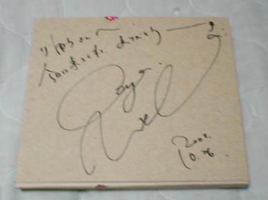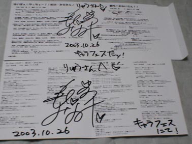 うい〜、久しぶりのこ〜し〜ん とてもじゃないけど時間がないので、キャラフェスで手に入れたモノだけでも ![]() 朝飯ついでで手に入れたマジンカイザーの食玩。スクランダーは別にあるらしく第2次仕様 ![]() おねいさん、草柳さん、和田嬢のCD ただし、草柳さんはサインチケット入手ならず。改めてその人気を実感 ちなみに各やっちゅーCDは2枚目。なにやってんだか ![]() おねいさんサイン「ドドンとやっちゃってください」の言葉通りにドドンとやってもらいました ![]() 和田嬢サイン、こちらもドドンとやってもらいました ちなみに今回は葉月でなく下の龍にしてもらいました、理由もないけど ![]() 秋バナナでCDを買ったり、サイン会に参加すると貰える券で ミニバスケフリースローができ、それでゴールして貰ったヤン☆パンTシャツ サイン貰う前にゴールできてれば、コレにもサインねだれたんだけどネ ![]() メビウスの桜花本とオービットのている本 ![]() ザウス。買えばライブ後にサインをしてくれるそうなので血迷って購入 でもほら、横手久美子さんの曲あるし、ライブで聴いた畑亜貴さんの『Chocolate Revolution』が耳に残ったし なんか2枚買ったら痴漢者トーマスのテレカが付いてきた ![]() 画像悪すぎるけどサインが入ってます。ミノフスキー粒子が濃いんでしょう ![]() ![]() なんとなくまほろさん、ビストロが見たくなっただけ で、P-mateだけどGROOVER特集のやつかと思ったら、この時はまだ売ってなかったのです ……簡単に言うと間違った これにて終了! なかなかの散財だ、ここまでやったのは最近では久しぶり あとは今週の月曜のバイトとバイトの合間に行った秋葉のブツがあります ホントに久しぶりに散財してるなぁ、このままじゃ持たないな お金も体も |