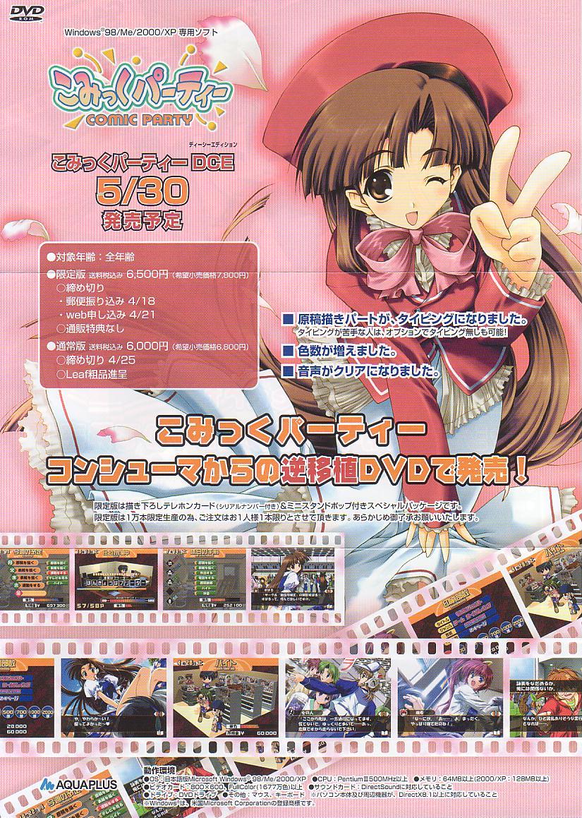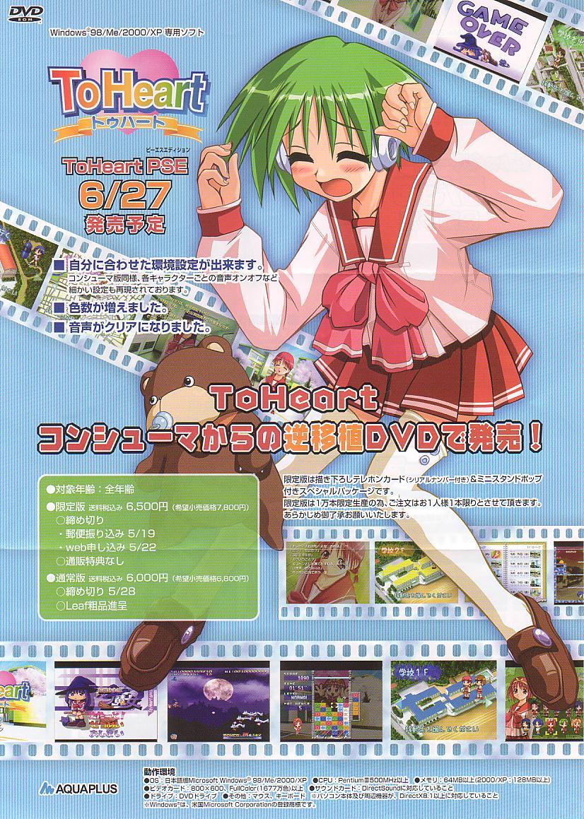■フリーター19日目〜運動不足解消〜 今日は市のトレセンで鈍った体に気合を入れに逝って参りました! 最後に逝ったのが3年前だったので、エアロバイクが新しくなってたり サンドバックが無くなってたりしてました。いいストレス解消になったのになぁ 明日には筋肉痛の波状攻撃が待ってると思います(汗 よくよく考えたら、保険証のコピーと封筒購入(プラチナウインドウ関連)のついでに逝ってきたのに 肝心の封筒を買ってくるのを忘れてしまった(泣)明日に回そ… ■舞台のレポをレポコーナーに移したんだったら、簡単な内容も追加しようかな? あれ、書くと長くなるから省いたんですけど、日記枠じゃないなら入れよかな☆ 他にも、急いで書いたから修正しなきゃいけない部分が多そうで恐いよ〜 ■ゴエモン。オールクリアー!!! つか、ノーダメージ勲章を全部取ったご褒美がサスケの最強武器ってのは、どーなのよ クリアしたら使う機会、無ぇよ! せっかくの武器なのにぃ〜 クリア後のオマケステージとか、昔みたいに遊園地とか欲しかったよ おもしろかったけど、オマケが無かったのは残念 最近ではクリア後のお楽しみなんてRPGですら、あるのになぁ 思えば、アクションゲームってオマケ無いかもね 思いつくのはロックマンだけだけどw 『今日のTOPニュース』 ねこねこソフト 『朱-aka-』発売延期のお知らせ 2003年4月25日に発売を予定しておりました「朱-Aka-」初回版につきまして、 発売を「2003年5月30日」に延期させて頂く事となりました。 皆様には多大なご迷惑をお掛けいたします事、深くお詫び申し上げます。 延期の理由は下記の通りとなっております。 1:製造の都合 当方で予定しておりました製造本数に対しまして、 各流通さまからご報告頂きました現在の発注数が大幅に越えてしまった為 ユーザーの皆様のご予約分すら充当できない状況となってしまいました。 つきましては、最低限予約分だけでもお買い求め頂けますよう、 発売日を延期し、増産させて頂く運びとなりました。 2:制作進行上の理由 現在、スタッフ総員で制作に取り掛かっておりますが、 全体の進行に遅延が生じております。 本来予定されていた発売日に間に合うかどうか、 現在のところ微妙な状況となっております。 上記2点の問題につきまして『万全を期す』為、 発売日を下記の通り延期し、完成させるよう鋭意努めさせて頂きます。 何卒ご理解の程宜しくお願い申し上げます。 2003年3月24日 ねこねこソフト 代表 片岡智晴 販売会社 担当 高野恵介 と、まぁ、延期になったわけですが、全然違うことを想像してました。会費とか というか、MMR読んでるとマジで予約しないとマズイっぽいですか? 延期になって、4月のお金はOVAみずいろだけになったので、ちょっと楽ですけど 他にも、諸葛更新、フリー素材更新などなど ちなみに追加されたアイコンは ![]() ![]() ![]() ![]() ![]() ![]() ![]() と、なっております。近々、うちの掲示板にも組み入れたいと思います 早くて明日には、やってあると思いますよ 戯画 『ショコラ』プロモ配布イベントレポ追加 ZERO 『いもうとは魔法使い』デモ公開 いちひめ 『犠淫母娘』OPデモ公開 植松伸夫です。 植松ラヂオ第23回配信、The Black Mages更新、N's DIARY更新 QR改編情報第一報 (グエンディーナ・ニュース 様) 「まさや・かおりのラブ×2エモーション」が一番重要かな? と思ったけど櫻井くん… 銀子さんとせいやん氏も『チェンジ ザ ワールド』を観に行っていた いたらすぐ分かるだろうなぁ、せいやん氏が ボーイズゲームカタログ&通販誌「Blueberry Vol.1」 3/25発売 以下1件(名前のない部屋 様) 買っちゃおうかなぁ(ぇ WellMADE 『グリーングリーン』DLに早苗、双葉のED曲追加 『アトリエ5(仮)』メインキャスト発表! 出演声優サイン色紙のプレゼントも 微妙すぎ 「まほろまてぃっく for 川澄綾子」3月26日発売! プレゼントのお知らせも 懸賞2連チャン 後藤邑子 [GOTU-WEB] ツブヤキ更新。チェンジ(略)は逝けなかったそうで、残念 feel TECHGIAN5月号「feel MANIAX」掲載中。feelスキーとしては買わねば |