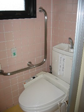 壁側の固定手すりの取り付け方が左右逆になっています。 縦方向の手すりは握って立ち上がる助けとなるもの。 この手すりはどのように使うことを考えてつけられたのでしょう・・・? 2005.12 |