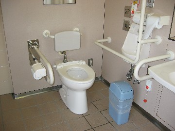 可動式手すりについているトイレットペーパーが外側を向いています。 便器に座って紙を取るなら内側につけるのでは??壁側のトイレットペーパーも位置が遠いようだし、座って取れるのかな?? それとも介助者と使うことを前提としたトイレ?? 2005.12 |