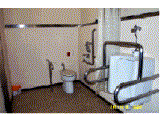 ■便器周り 両側固定手すり・洗浄レバーの位置が高くて手が届きにくい。非常呼び出しが便器背後の壁面にあって手が届きにくい。