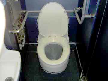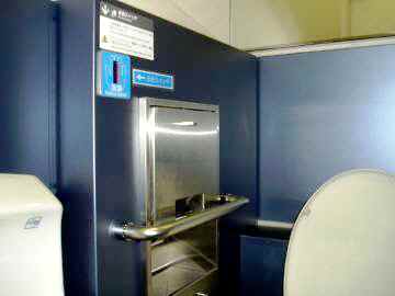 | 蓋付便器。両側固定手すり。 手前に手洗い器。 |