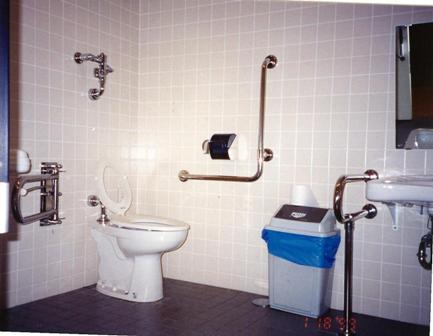| 壁側固定手すり 反対側可動手すり 手すりつき洗面台 子供用便座・ゴミ箱あり |