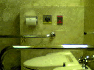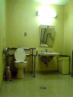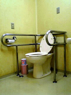 | トイレ全体。固定手すり。傾斜鏡。 | 便器周り |