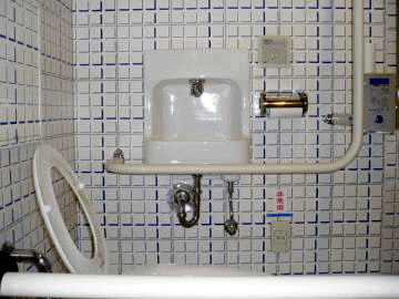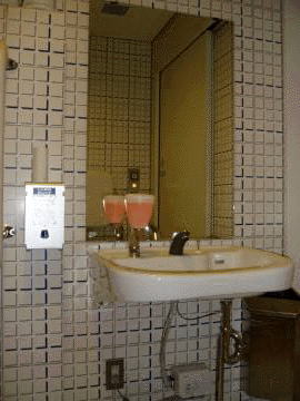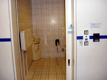 地下一階に2つのブースがある。インタフォンで連絡しないと入室できない。室内のタイルは騒々しくて落ち着かない。
