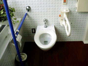 | トイレ全体。壁側固定手すり・反対側可動手すり 背もたれ無し 便器後ろの壁に非常用・洗浄用ボタン |