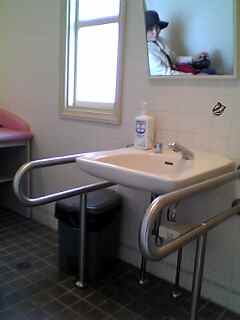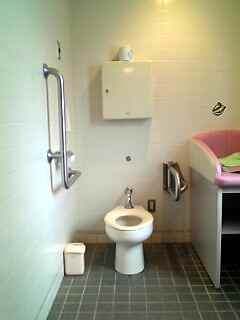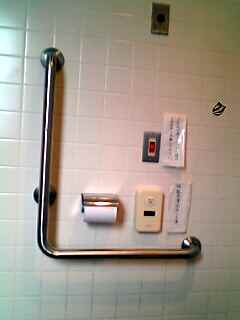 | 便器周り。L手すり。 横方向可動手すり(横にオムツ換えシートがあり動かせな い)。 便器高約39センチ。 |