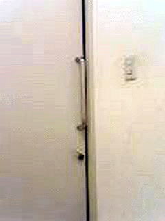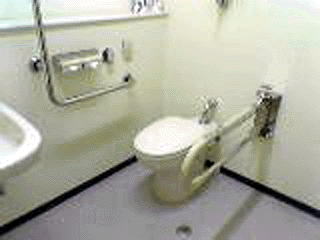 | 洗面台。手すり付。 | 壁面設備。 ペーパーホルダー、洗浄ボタン。 |
