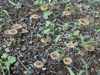 地面の上にたくさん発生する、やや地味なきのこです。