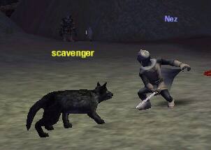Exp効率がいい、名前が青いモンスターに、hobgoblin snaggerというのがウジャウジャいるんだけど、こいつには勝率六割って感じで、勝ってもずたぼろ。なのでしかたなく、経験値の入りの少ない、ギリギリ名前が緑の、生息数の少ない、黒い犬を狙うのだ。