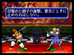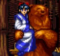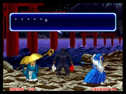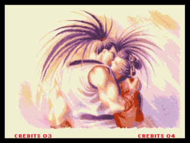 エンディングの一コマ、手負いの覇王丸をかばうお静、それに免じて今日のところは・・な幻十郎