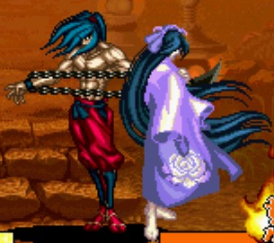 Where do we go? Where we go now? 海を渡ってきた正義忍者ガルフォード。 鬼の所業を許せるわけもなく、村人に鬼退治を頼まれます。 うむ。彼らしいストレートなストーリーだ^^ 今回修羅と羅刹キャラを選べるのですが、羅刹の彼は パピィ(犬)を連れていないんです!おお〜! 犬を使わない彼を使える日がくるなんて・・と当時は思いましたね。 犬を使ってるときよりも、雷を多様に使って戦います。