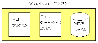 VB プログラムが実行されると、Jet データベースエンジン(DBMS に相当するもの)とよばれるソフトウェアがリンクされます。 このデータベースエンジンによって、VB プログラムの SQL が解釈され、MDB ファイルに物理的な操作が行われます。