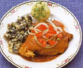| 1位 ピカンテ・デ・レングア(Picante de Lengua) ピカンテとは辛いという意味で、レングアは牛タンの事。 牛タンを柔らかく煮込んであり、それにトマトソースをベースにした辛いソースが かかっている料理。その他、同じ味付けでピカンテ・デ・ポジョ(鶏のモモ肉)、ピカン テ・デ・ミクスト(牛タンと鳥のモモ肉が半々)、ピカンテ・デ・コネホ(ネズミのようなウ サギ)などがあります。 (右の写真はピカンテ・デ・ポジョ) |