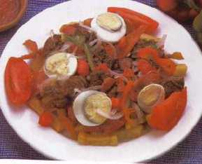 | 2位 ピケ・マッチョ (Pique macho) 日本語でもマッチョマンなんて言葉がありますよね。 マッチョとは単純には雄を意味し、一般的には男らしいとか、勇敢なとか、大きい なんて意味で使われています。 ピケマッチョは、そんなイメージにぴったりの料理です。 大きな皿にの一番下にまず、プライドポテトが山盛りに敷かれ、その上に、ひつ口 サイズの牛肉のブロックとウィンナー、さらにその上にトマト、玉ねぎ、ロコトと呼ば れる辛いピーマンの輪切りが散りばめられます。通常この料理は4人ぐらいのグル ープ向きの大皿料理です。 男性だったら2人、女性だったら3人ぐらいまでだったら、 Medio Plato(半皿)を頼んだ方が良いでしょう。 ボリビア料理は、料理によって半皿 で頼めるのでメニューにMedioと書かれてあるものがあったら、量が多いと思って半皿 を頼んでおいた方が無難だと思います。 |