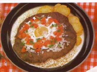 | 5位 シルパンチョ (silpancho) ハムカツのような料理。 肉は豚肉ではなく牛肉で、ステーキをたたいてハム ぐらいの厚さまで薄くのばしパン粉をまぶしてあげた物の上に、目玉焼きとトマ トと玉ねぎのみじん切りのサラダを乗せた料理。 シルパンチョはボリビアの大衆料理で、コチャバンバやサンタクルスにはシルパン チェリアというこの料理のみを出す店があり、早い、安い、美味いといった日本の 牛丼屋的存在です。 |